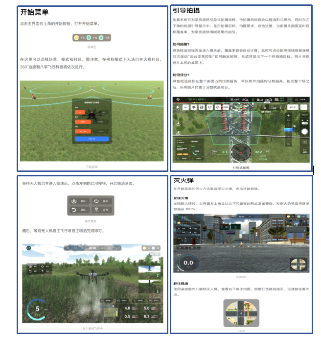 虚拟现实三维互动教学资源需支持六大应用场景,包括:无人机考证培训飞行训练、无人机组装调试、无人机电力巡检、无人机农业植保、无人机物流配送、无人机应急救援。